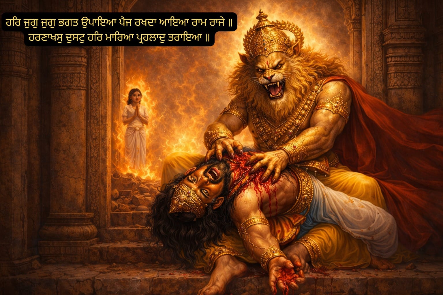 So, to destroy the arrogant Harnakash and to protect the honor of His true devotee, the formless and all-powerful Lord created the form of Narsingh. Through this form, Waheguru used His divine power to destroy the evil Harnakash and save His devotee Prahlad. This way, He honored devotion. After bringing justice, the Lord withdrew his power from Narsingh’s form, and it disappeared.