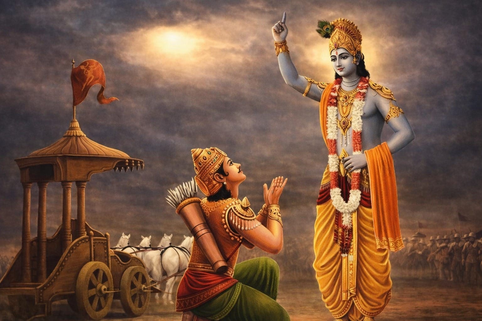 Krishna is believed to be an Avtaar (incarnation) of the deity Vishnu. Like all mortals, he performed many noble deeds, but he was not free from shortcomings. He possessed exceptional beauty and divine powers, attributes typically associated with Avtaars. During the battlefield discourse with Arjuna, Krishna proclaimed himself to be the Supreme God. According to traditional belief, he is considered the most powerful Avtaar, said to have possessed 16 kallaa (divine qualities). Raam Chandra is described as having 14, while previous Avtaars are believed to have had even fewer.
