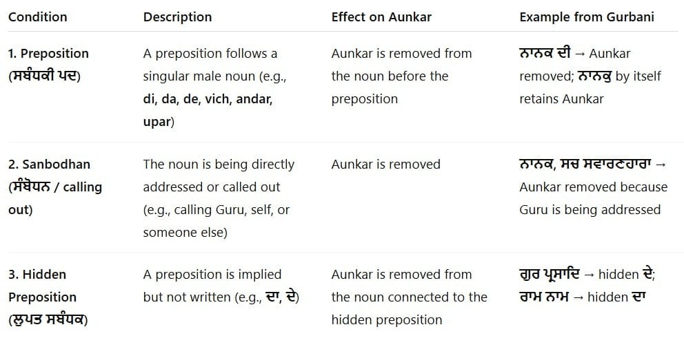 If a noun has an Aunkar, prepositions like เจฆเฉ, เจฆเฉ, เจฆเจพ cannot be attached to that word. This rule should be kept in mind when understanding the meaning of Gurbani.