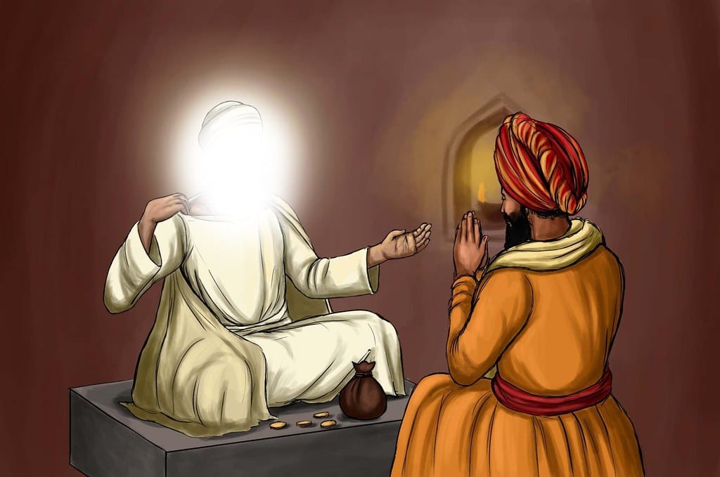 At this point, Makhan Shah was in a shock state. He had done ardaas that the real Guru would ask him for the full amount but he had not imagined how it would feel if this ardaas really materialized. As Makhan Shah was standing there, totally awed, Siri Guru jee removed his kambal (loyee, shawl) and showed him his right shoulder that was bruised. Siri Guru jee told him that to fulfil his ardaas to save his ship from drowning,, he had incurred this wound.