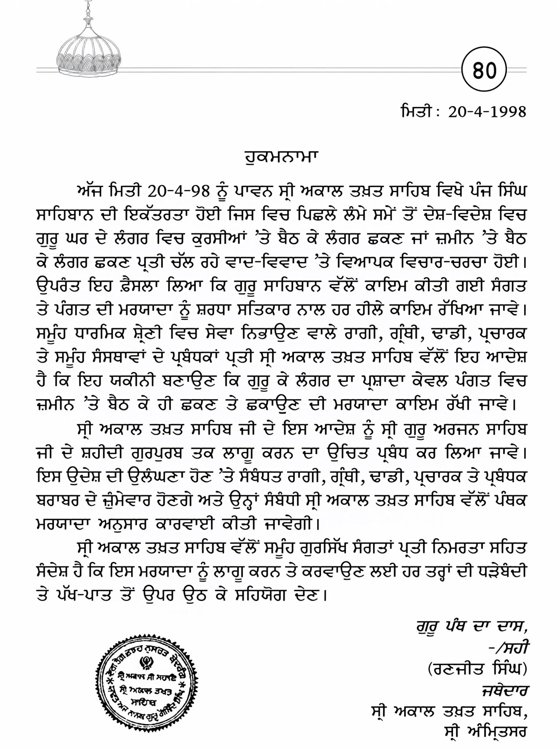 m. There should be no discrimination or prejudice when it comes to sitting in the Sangat (congregation) — whether someone is Sikh or non-Sikh, or based on caste, social status, or Brahminical beliefs that classify people as high or low, touchable or untouchable by birth.
