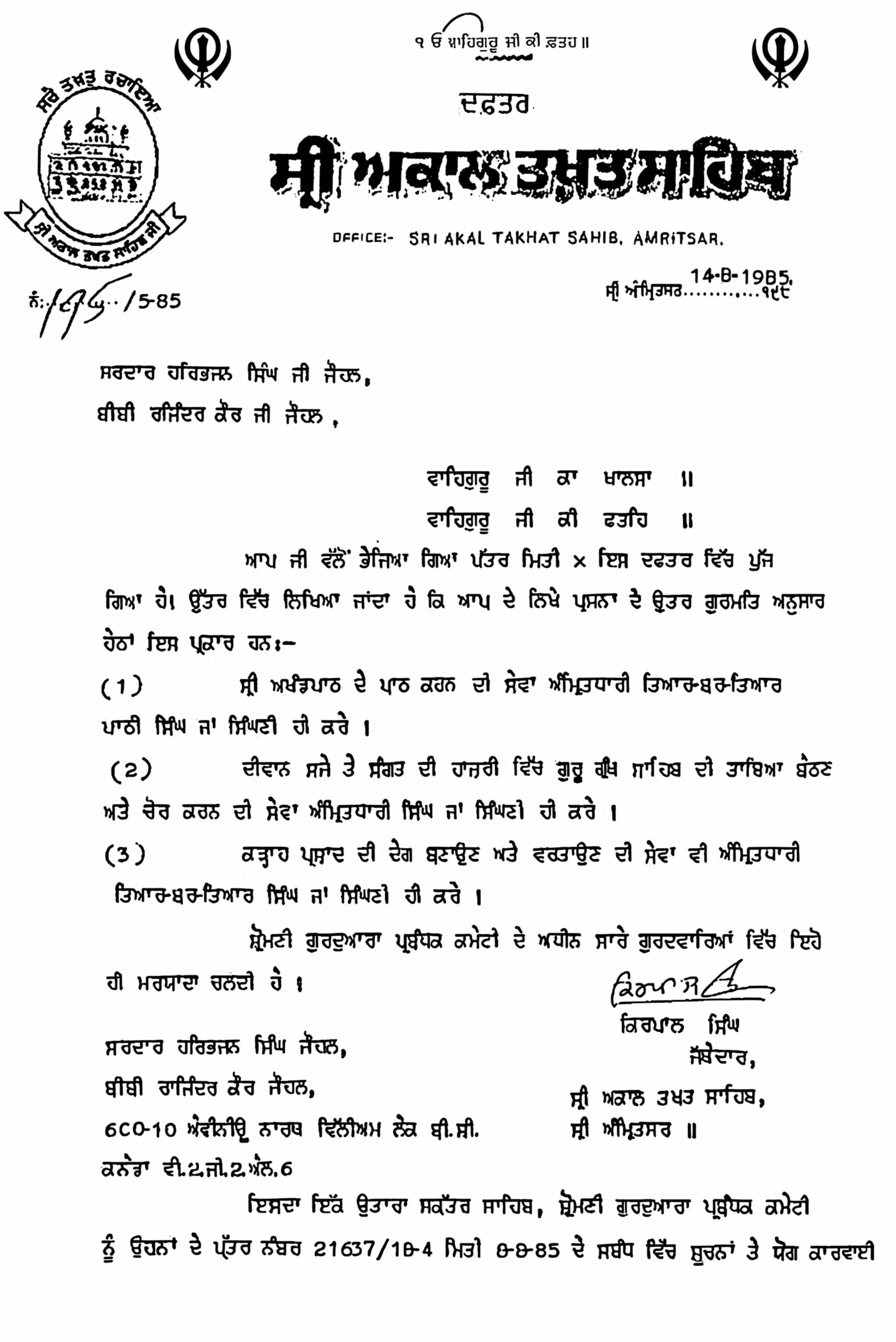 f. Hukam must be taken at the end of the Divaan (congregational session) or after the Ardaas for Bhog (completion).